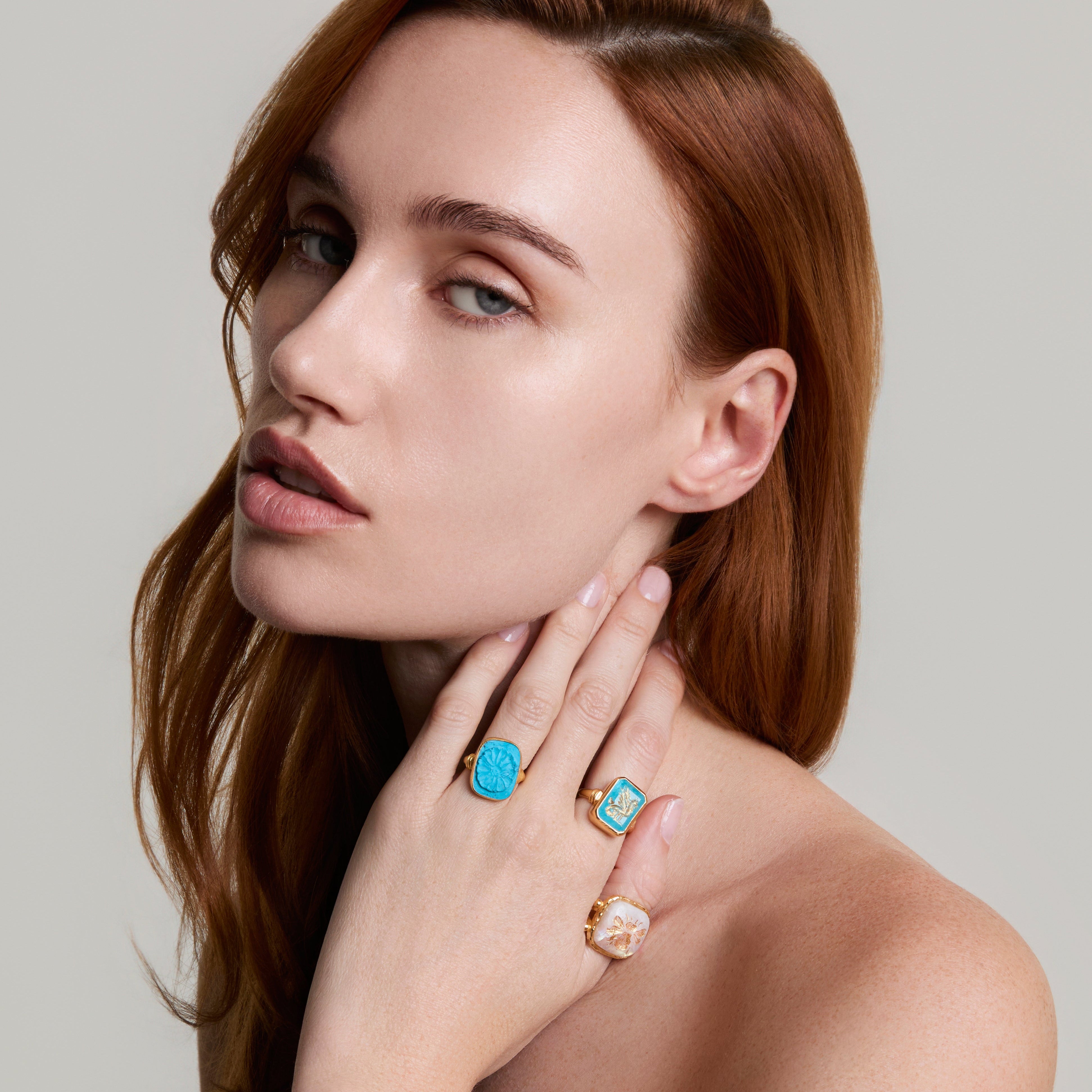 The Legend Ring is hand sculpted with 22k gold vermeil on 925 sterling silver and delicately engraved Griffin on top of Paraiba Tourmaline gemstone, finished with gold leaf touch. The Griffin is a legendary animal that is referred to as half-eagle in numerous cultures, half-lion hybrid, that has been used to protect gold and priceless possessions. In ancient mythology this mythical creature has been used to signify power, military bravery, and leadership.
